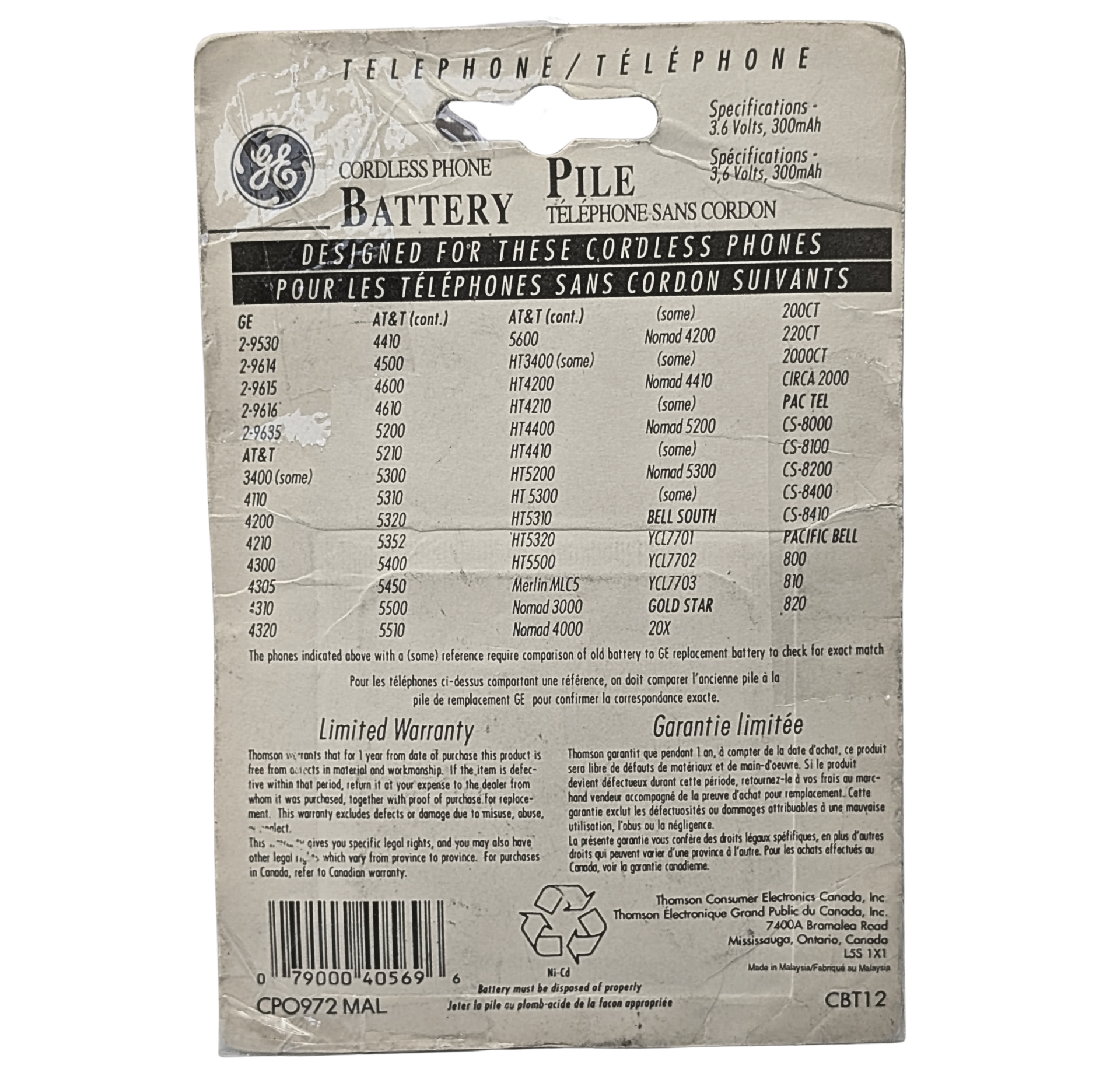 GE Cordless Phone Battery CBT12 BT12 3.6V 300mAh Ni-Cd New Sealed Vintage NOS