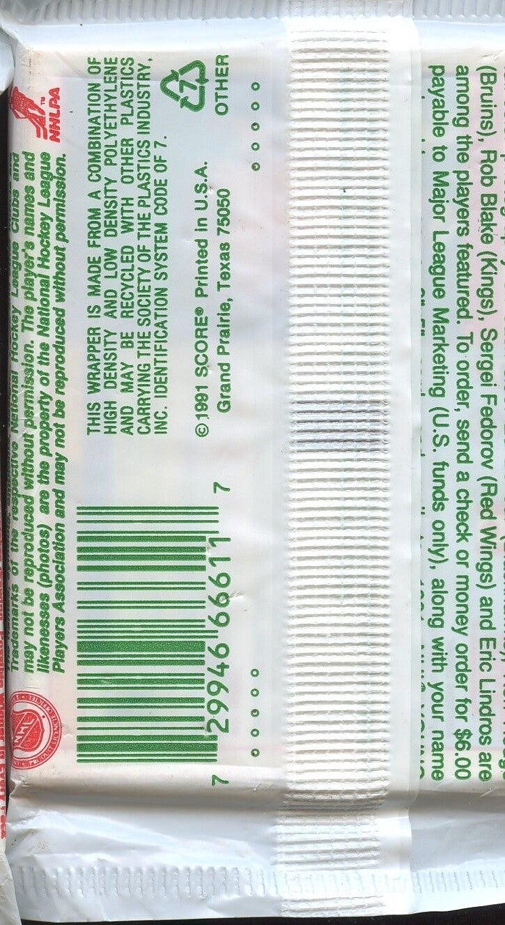 Listing: Sealed vintage 1991 Score NHL Hockey Series 1 English pack with 15 player cards. Nice unopened pack for hockey card collectors. Please review photos for wrapper wear. Current sealed-pack
