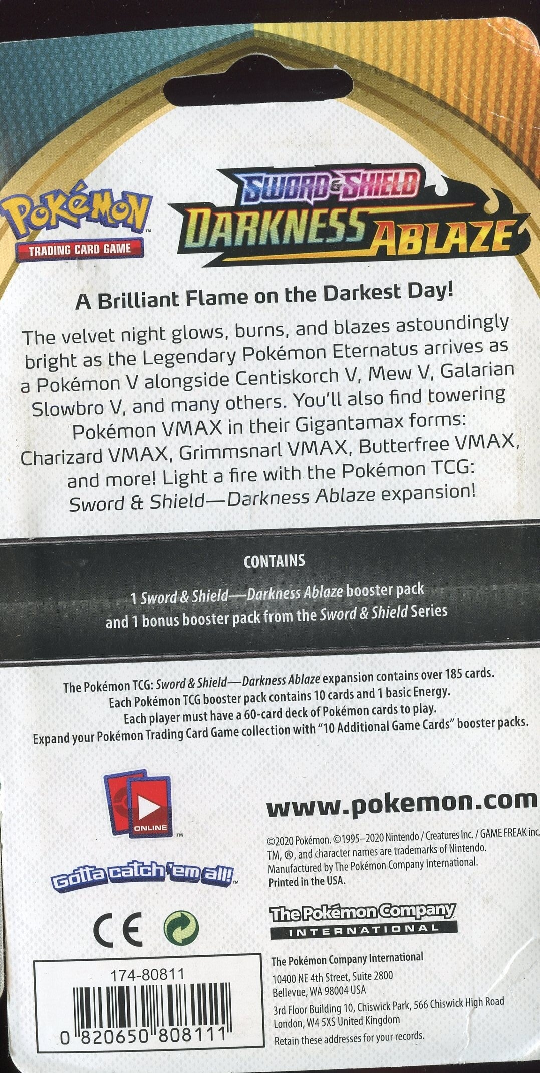 Brand new factory sealed Pokémon TCG Sword & Shield Darkness Ablaze 2-pack blister. Includes 1 Darkness Ablaze booster pack and 1 bonus Sword & Shield Series booster pack. Great for collectors, sealed product buyers, or pack artwork collectors. Please review photos for package condition and shelf wear.
